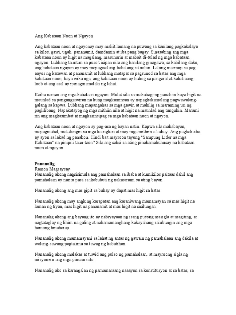 Noon at ngayon Sa modernong panahon ang mga kabataan ay maaaninag kung saan-saan mayroong nasa mga bars at nagliliwaliw kung saan-saang lugar papaano na tayong matatawag na pag-asa ng bayan kung ganoon ang ating gawi at kilos. Pero bago muna natin talakayin ang isyung iyan alamin muna natin kung ano. Ang kabataan noon at ngayon ay may maliit lamang na puwang sa kanilang pagkakalayo sa kilos gawi ugali pananamit damdamin at iba pang bagay.